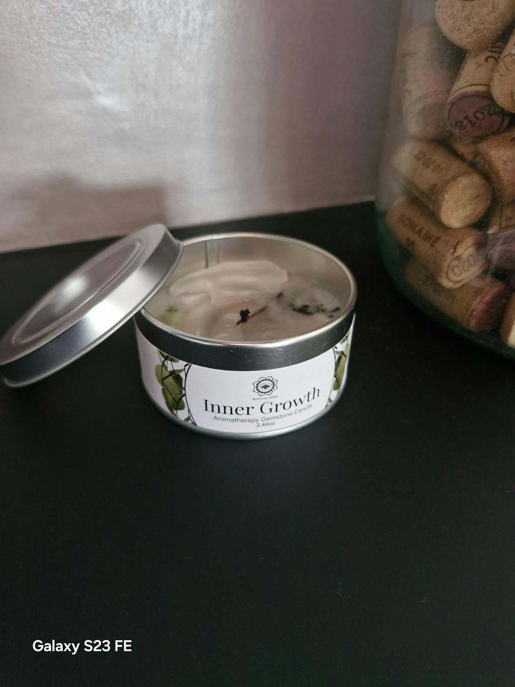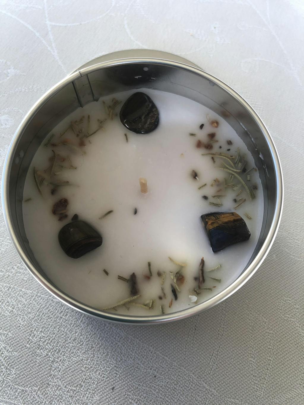Bougie unique et fabriquée à la main, incrustée de minéraux et fleurs séchées.