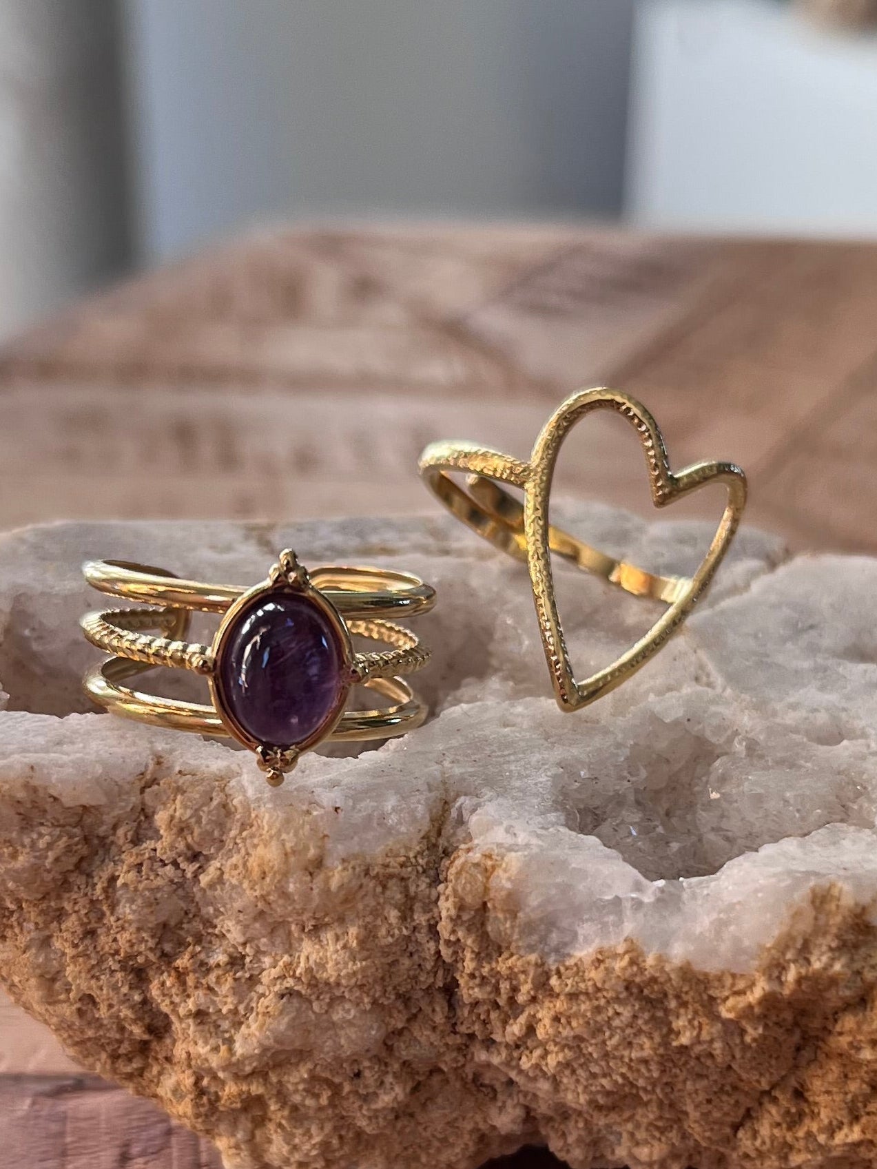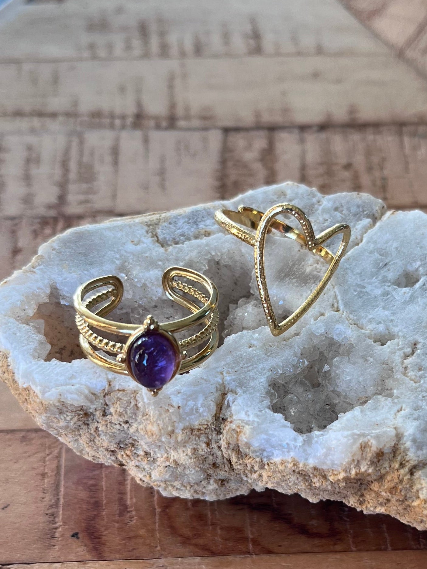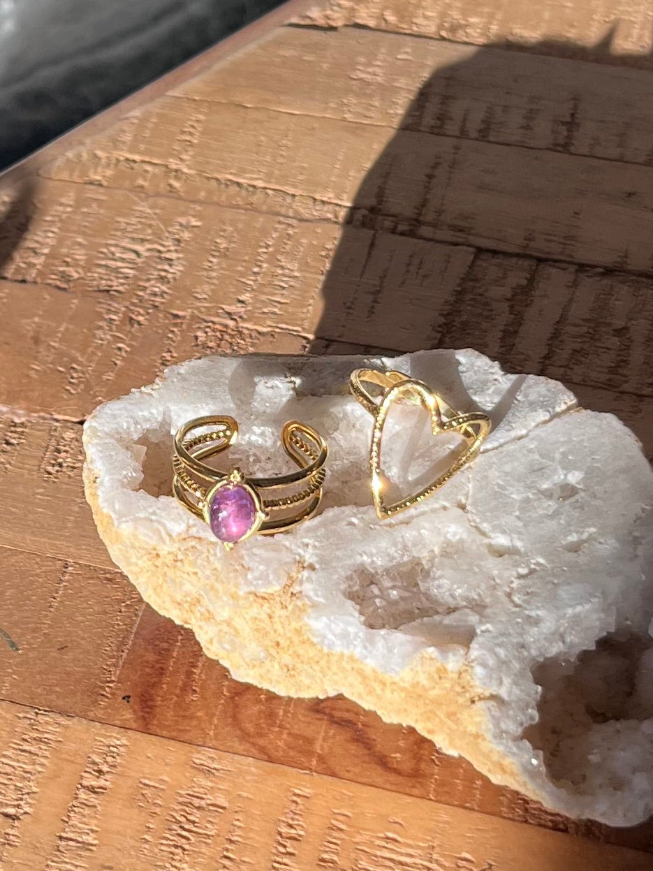 Duo de bagues cœur & améthyste - doré